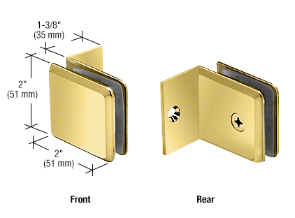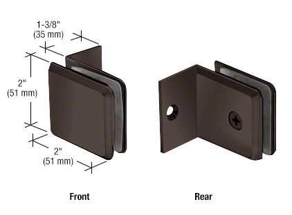 90 Degree Bevelled Wall to Glass Clamp, with short leg fixing plate, suitable for 10-12mm Glass, requires a 16mm hole in glass. Solid Brass Body. Chrome, Brushed Nickel and Polished Brass & Oil Rubbed Bronze finish.